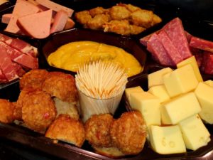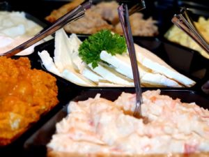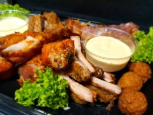 Opgemaakte koude schotel met rauwe ham, ham-asperge-rolletjes, tomaatjes en garnering.